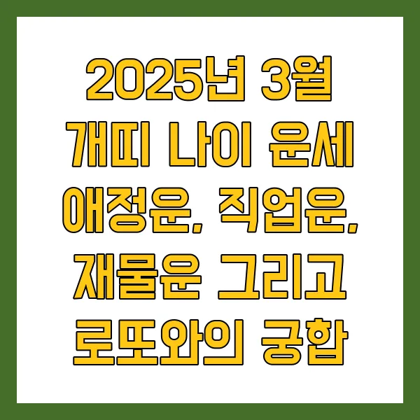 계묘년 2025년 3월, 개띠 여러분의 운세 가 궁금하신가요? 다가오는 3월, 여러분의 삶에 어떤 변화와 기회가 찾아올지 깊이 있게 분석해 드리겠습니다. 본 포스팅에서는 개띠의 2025년 3월 애정운, 직업운, 재물운 을 상세하게 다루어 여러분의 성공적인 삶을 위한 지침을 제시하고자 합니다. 특히, 많은 분들이 궁금해하시는 로또 당첨 가능성 개띠에게 행운을 가져다줄 팁 까지, 놓치지 마세요. 전문적인 분석과 통계를 바탕으로 2025년 3월, 개띠의 운명 을 낱낱이 파헤쳐 보겠습니다.