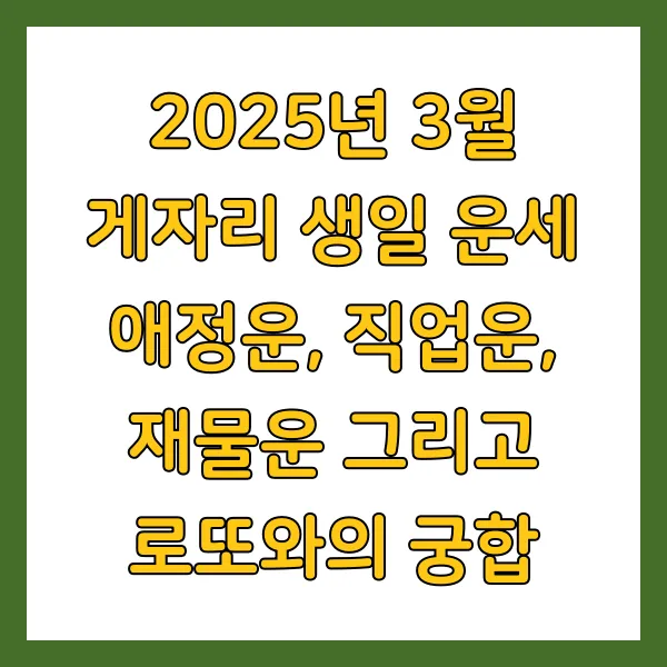 2025년 3월, 당신의 삶에 변화의 바람이 불어올 것입니다. 게자리 에게 있어 2025년 3월은 인생의 중요한 전환점 이 될 가능성이 높습니다. 본 포스팅에서는 게자리의 2025년 3월 운세를 심층적으로 분석하여 애정운, 직업운, 재물운 을 정확하게 예측해 드립니다. 미래를 예측하는 것은 불확실성을 내포하고 있지만, 천체의 움직임 과 당신의 잠재된 가능성 을 분석함으로써 앞으로 나아갈 방향을 제시해 드릴 수 있습니다. 행운의 기회를 잡고 싶으신가요? 로또와의 궁합 까지 분석하여 행운을 극대화하는 방법 또한 알려드리겠습니다.