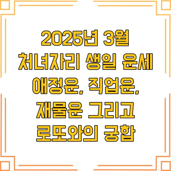 섬세한 분석력과 실용적인 지혜를 지닌 처녀자리에게 2025년 3월은 어떤 의미를 지닐까요? 본 포스팅에서는 처녀자리의 2025년 3월 운세 를 심층적으로 분석하여 애정운, 직업운, 재물운의 흐름을 예측 하고, 성공적인 재테크 전략을 제시 합니다. 특히, 많은 분들이 궁금해하시는 로또와의 궁합 을 통해 행운의 가능성 까지 탐색해보는 시간을 마련했습니다. 데이터 기반의 분석과 전문적인 해석을 통해 여러분의 3월을 더욱 풍요롭고 의미 있게 만들어줄 통찰력 있는 정보를 제공해 드리겠습니다.