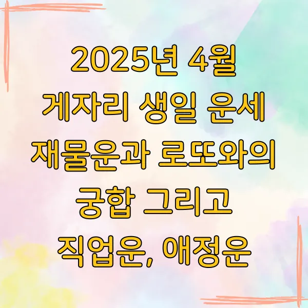 4월의 봄바람처럼 따스하면서도 변화무쌍한 기운이 게자리 주변을 감싸는 2025년 4월! 재물운 은 어떤 풍경을 그리고 있을까요? 로또 당첨 이라는 짜릿한 행운은 게자리에게 미소 지을까요? 직업운 은 새로운 도약을 향한 문을 열어줄지, 그리고 사랑과 연애 에서는 어떤 설렘이 기다리고 있을지 궁금하지 않으신가요? 게자리의 2025년 4월, 운명의 별자리가 속삭이는 이야기에 귀 기울여 보세요. 당신의 잠재된 가능성 을 일깨우고 미래를 향한 나침반 이 되어줄 특별한 메시지가 기다리고 있습니다. 깊은 밤하늘처럼 신비로운 4월 운세의 세계로 여러분을 초대합니다.