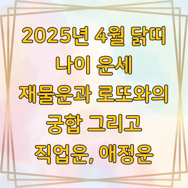 2025년 4월, 닭띠 여러분의 재물운은 마치 롤러코스터를 탄 듯 짜릿한 변동성 을 예고하고 있습니다! 마치 밤하늘의 별처럼 반짝이는 기회와 예측 불가능한 변수들이 마구 섞여 있는 형국이죠. 이 시기에 재물운을 결정짓는 핵심 키워드는 바로 ' 선택과 집중 '입니다. 마치 잘 훈련된 궁수처럼, 여러분의 에너지를 어디에 집중시킬지 날카로운 판단력이 요구되는 시기입니다.