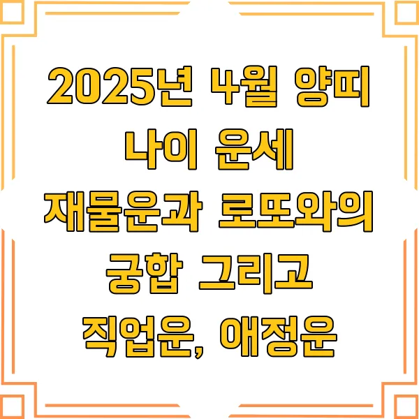 푸른 초원 위를 자유롭게 뛰어다니는 양처럼, 2025년 4월, 당신의 운명은 어떤 풍경을 그려낼까요? 재물운 은 들판에 펼쳐진 풍요로운 풀밭처럼 싱그러울지, 아니면 메마른 사막처럼 험난할지 궁금하지 않으신가요? 2025년 양띠 나이 운세 를 통해 재물운의 흐름을 예측하고, 로또 당첨 이라는 짜릿한 행운과의 궁합을 점쳐보는 건 어떨까요? 더 나아가 당신의 재능을 꽃피울 수 있는 직업운 과, 운명적인 사랑을 만날 수 있는 애정운 까지, 양띠의 2025년 4월 을 다채롭게 탐험해 보는 여정에 여러분을 초대합니다. 예측 불가능한 미래를 향한 설렘과 기대감을 가득 안고, 함께 떠나보시죠.